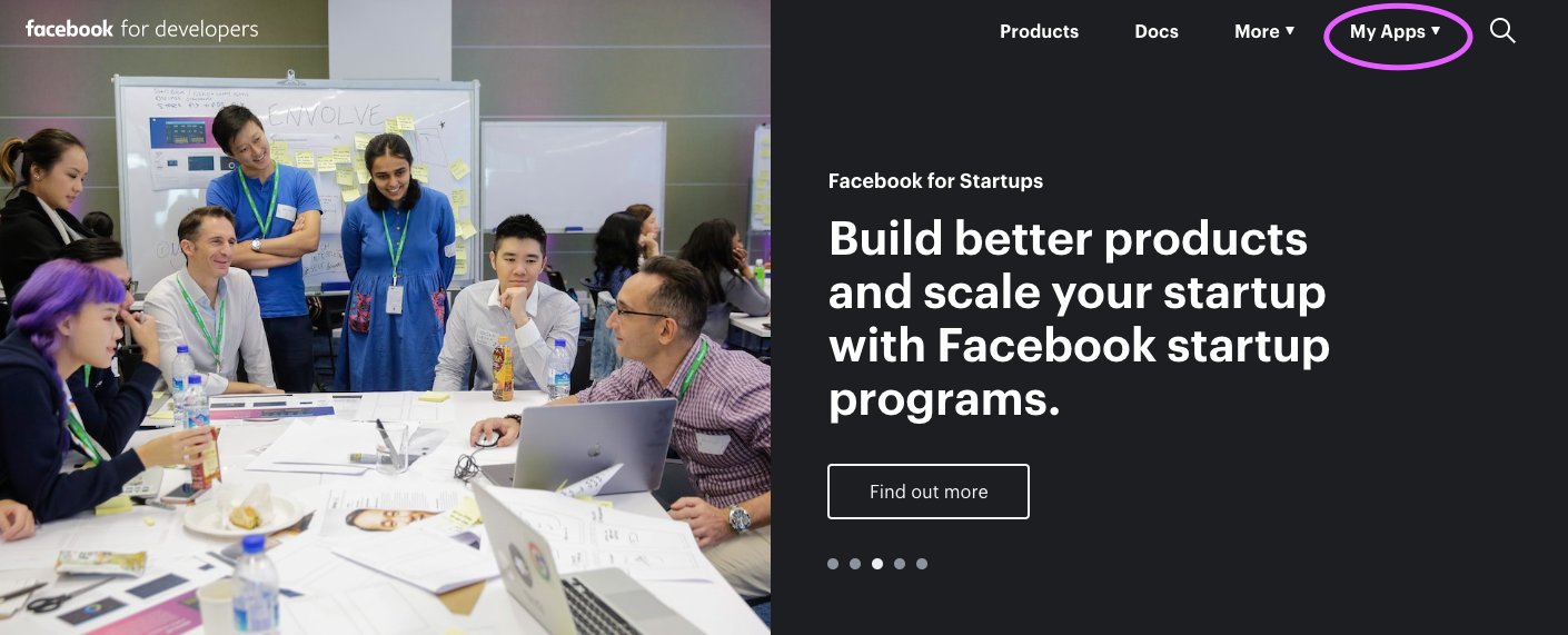 1. Accesati url-ul: http://developers.facebook.com/ si faceti click pe GetStarted sau My apps, in coltul din dreapta sus al paginii: