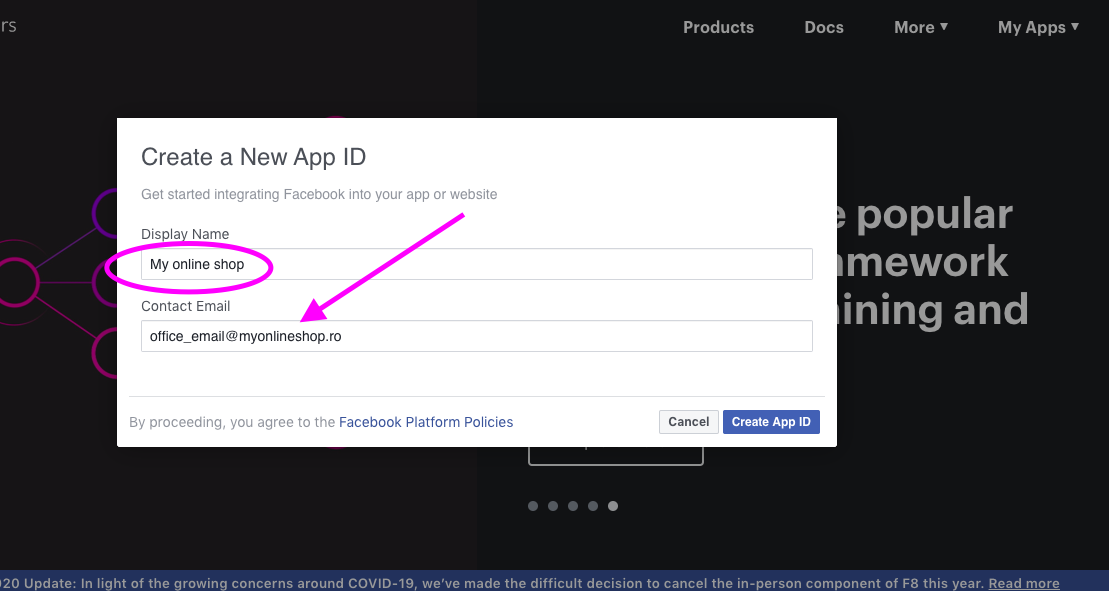 Adaugati numele magazinului 8Display Name*( ex: My online shop ) si o adresa de email (ex. office_email@myonlineshop.ro):