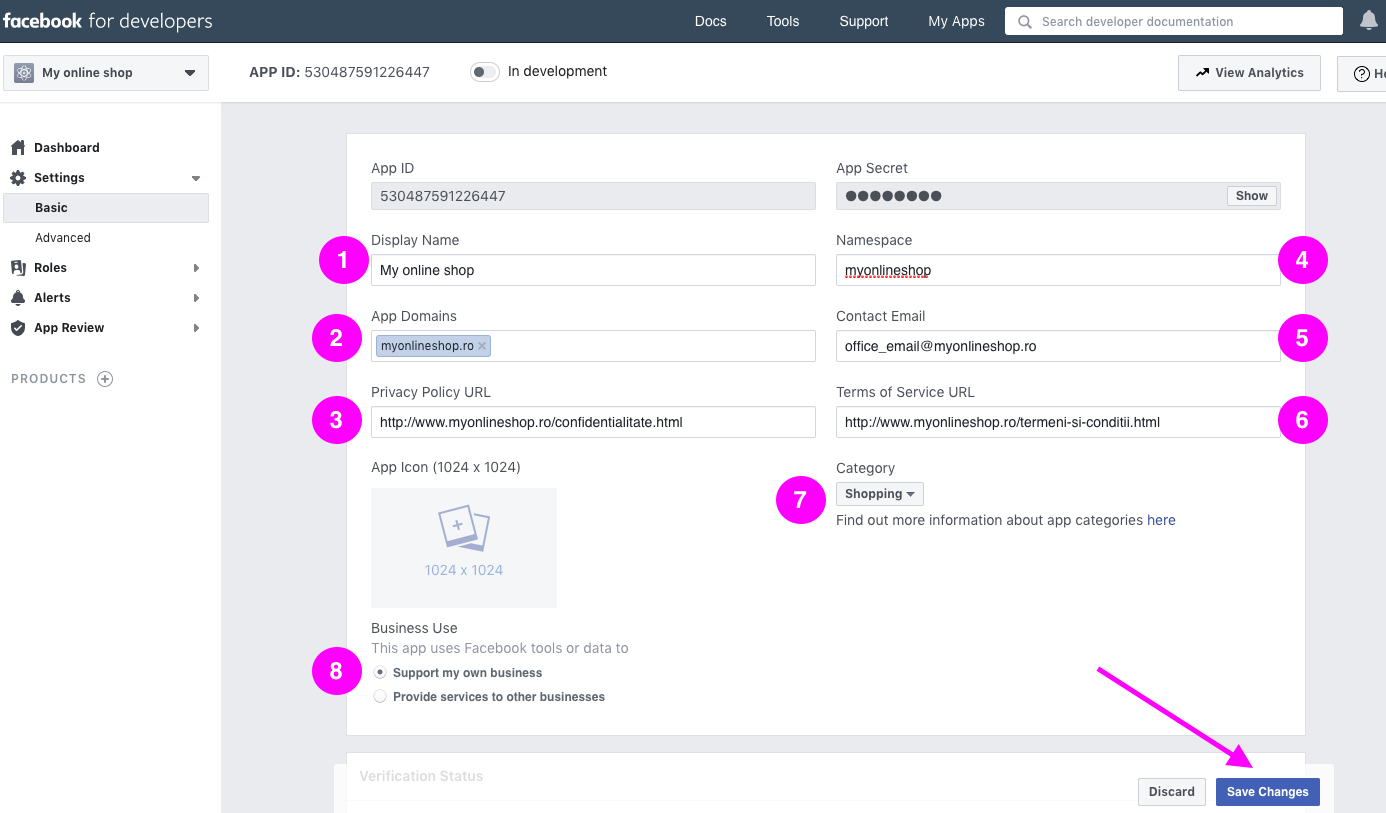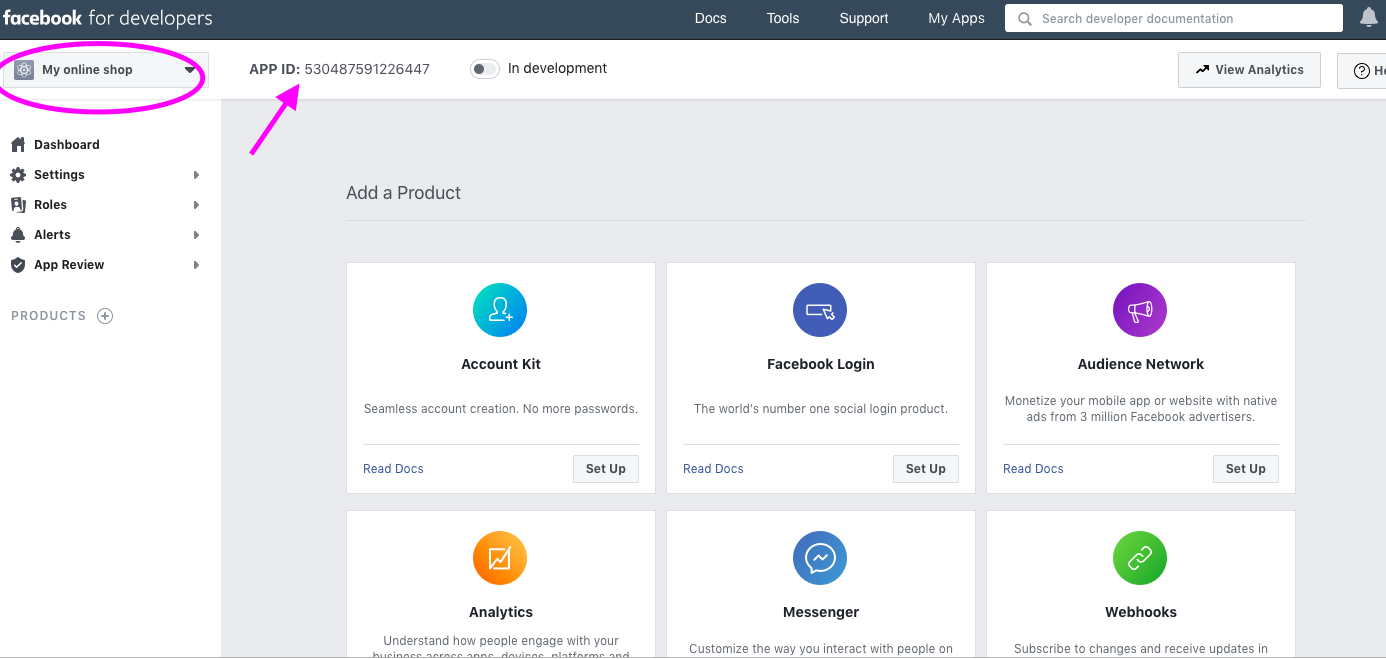 Dupa ce ati urmat pasii de mai sus veti ajunge pe o pagina similare unde s-a generat un App ID si numele magazinului in partea stanga sus a imaginii.