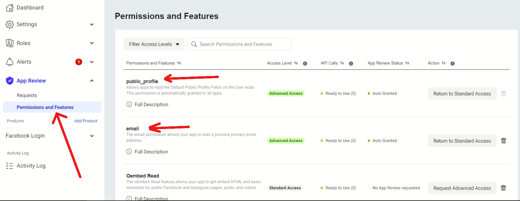 In zona de Permissions and Features trebuie setate cu Advanced Access campurile de email si public_profile.
